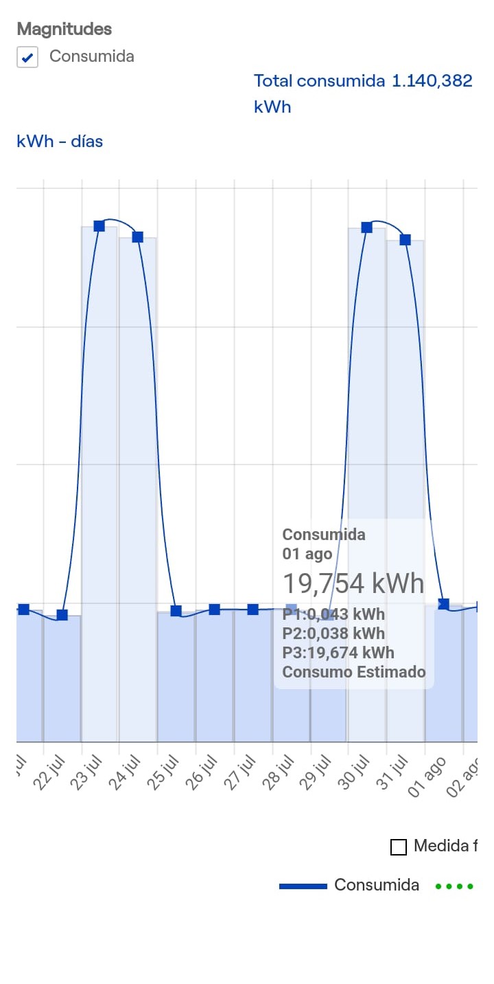 Hay amigo, aquí los usuarios del plan vehículo eléctrico nos vemos en un problema, porque la empresa distribuidora, en nuestro caso Endesa distribución, no va a hacer una estimada en relación a los horarios habituales de carga del usuario 1-7 am, sino que se va a limitar a rellenar el 100% de las horas de la p3 que es entre 12 y 8 de la noche y 24 horas durante el fin de semana ( podéis ver el ejemplo en el siguiente gráfico) lo que nos conlleva al usuario un cobro de unas 170 horas mensuales en horario no promocionado si la estimada cubre todo el mes.