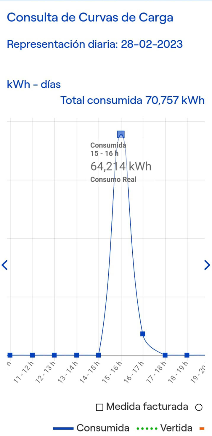 Y después de denunciar públicamente en la segunda entrevista la estafa continuada a la que se sometía al caballero José María Martínez ahora es Endesa la que está manipulando las curvas de carga de José María, de una manera muy burda, eso sí, porque facturar 60 kilovatios en solo una hora como «consumo real» a un cliente que tiene una potencia contratada de 7kw/h no resulta muy verosímil y que esto se repita día tras día… Al menos agradecemos a Endesa que la manipulación sea tan evidente, que pasen un poco de vergüenza al hacerlo público desde la plataforma seguro que les ara pensar un poco.